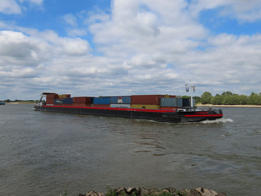 Het Motorvrachtschip Condor in de opvaart op de Waal bij Ooij.