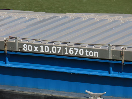 Lengte 80 x breedte 10,07 m. Laadvermogen 1670 ton.