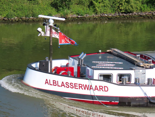 Motorvrachtschip Alblasserwaard in de afvaart op de Waal bij Rossum.
